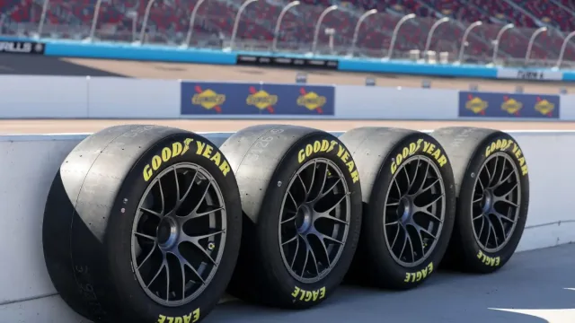 These tires are the Goodyear Eagle 18-inch Superspeedway Radials, which bear a resemblance to those used in the Daytona NASCAR race. The setup includes one set for qualifying and seven sets available for the race.