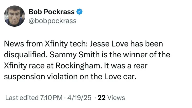 Bob Pockrass of FOX Sports captured footage of Xfinity Series Director Eric Peterson explaining the situation. During this demonstration, Peterson described the components of the car and highlighted the nature of the violation: “This is the left-side truck arm, the rearend housing, the U-bolt saddle, and then the lowering block right here, and then the U-bolt that holds this whole assembly together,” he stated. “So, the rule that was violated was that all the mating surfaces between the U-bolt saddle and the truck trailing arm have to be in contact with each other at all times.”