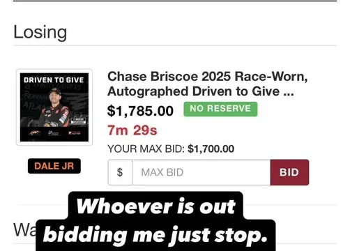 Noah Gragson notably became a focal point by entering the auction for Chase Briscoe’s signed gloves. Unfortunately for Gragson, Briscoe’s gloves were eliminated in the early round of bidding, preventing him from making a successful bid. Gragson’s lighthearted reaction was shared with fans via social media.